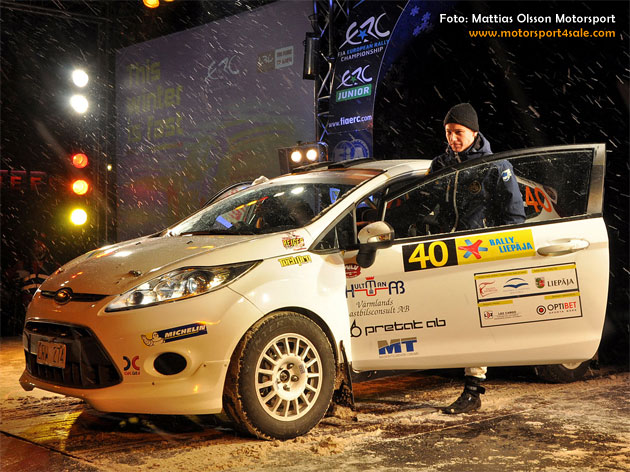 Lördagens sex sträckor av EM-premiären för juniorer är nu avverkade i landsbygden kring Lettländska Liepãja. Mattias Olsson från Kil med Sophia Karlsson, Nykvarn, i högerstolen, presterar topptider på de snabba Lettländska grusvägarna. Detta trots att bromspedalen gått i botten redan på specialsträcka två.