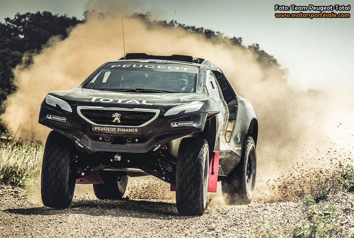 Femfaldiga Dakarvinnaren Cyril Despres är sist ut i Peugeots stjärnförartrio att testa den helt nya bilen. Rutin i massor, ändå med en stor skillnad mot tidigare lopp: Nu är det fyra hjul i stället för två som gäller. Testet görs i stenig terräng som påminner om underlaget i det tuffa ökenrallyt som går av stapeln i Sydamerika med start i januari.